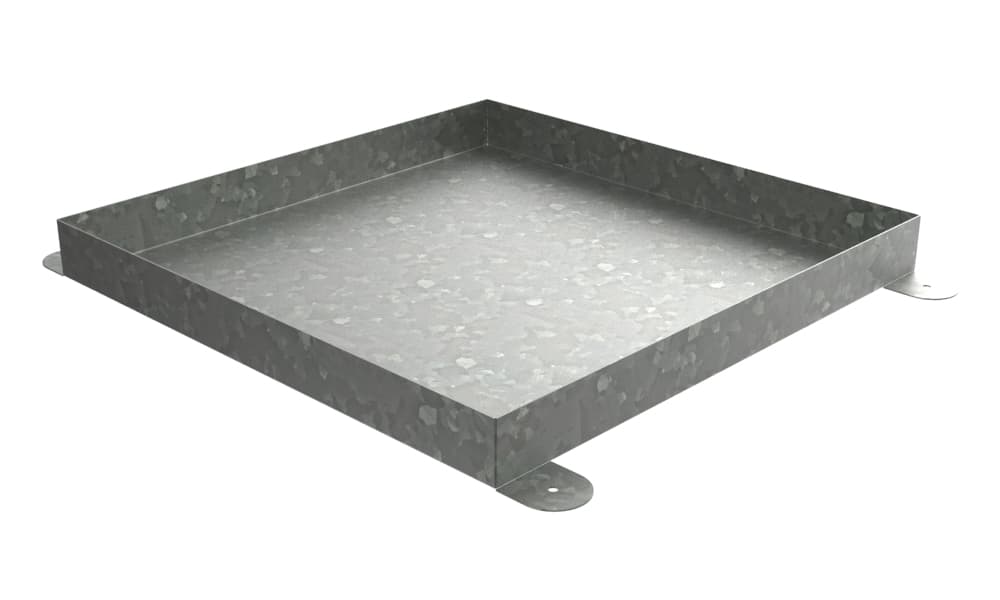 You won't have to keep tabs on this drip pan! Our Floor Mount Drip Pans have fastening tabs that allow you to secure the pan to a floor or substructure. Once fastened to the floor, this pan will remain stationary. Our Galvanized Floor Mount Drip Pan is made with fully welded corners and hemmed edges for added strength. Material options are stainless, galvanized, aluminum or cold rolled steel. If your situation has a constant flow requirement click the Request a Quote link below to get information on a custom tray.