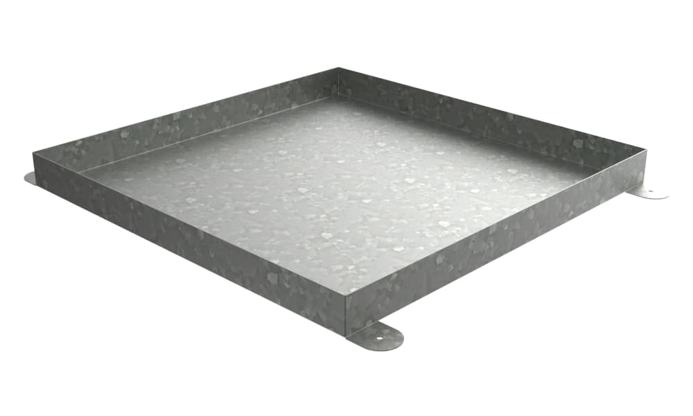 This 2 foot square containment pan is galvanized for corrosion resistance and has floor mounting tabs that allow it to be fixed in place underneath any potential leak. In applications where immobility of your spill containment pan is important, this is the solution. Our Galvanized Floor Mount Drip Pan is made with fully welded corners and hemmed edges for added strength. Material options are stainless, galvanized, aluminum or cold rolled steel. If your situation has a constant flow requirement click the Request a Quote link below to get information on a custom tray.