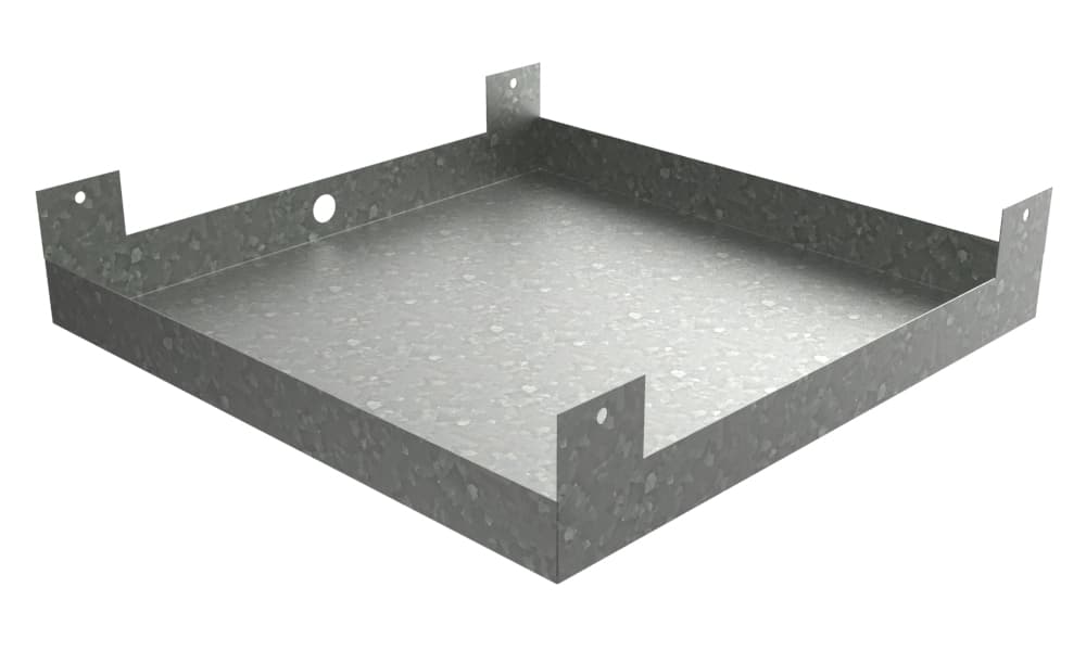 This is an Industrial Drain Pan made with hanging tabs for elevating the pan under drips and leaks from roofs or suspended equipment. The galvanized materials used on this Hanging Pan makes it perfect for industrial applications. Our Industrial hanging Drain Pan is made with fully welded corners and hemmed edges for added strength. Material options are stainless, galvanized, aluminum or cold rolled steel. If your situation has a constant flow requirement click the Request a Quote link below to get information on a custom tray.