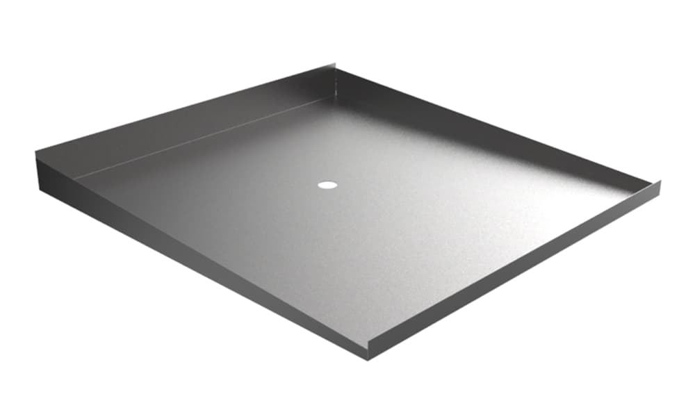 This stainless steel drain pan is designed with a low profile format for front load washer containment. The pan has a 1.38 inch diameter drain hole cut into the center of its bottom and the walls of the pan taper from 3 inches at the back to 1.25 on the front wall and .75 inches on the sides walls. The brushed finish on the stainless material used to manufacture this pan makes for an aesthetically pleasing washer drain pan.