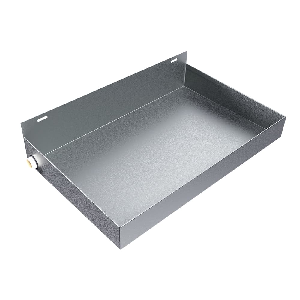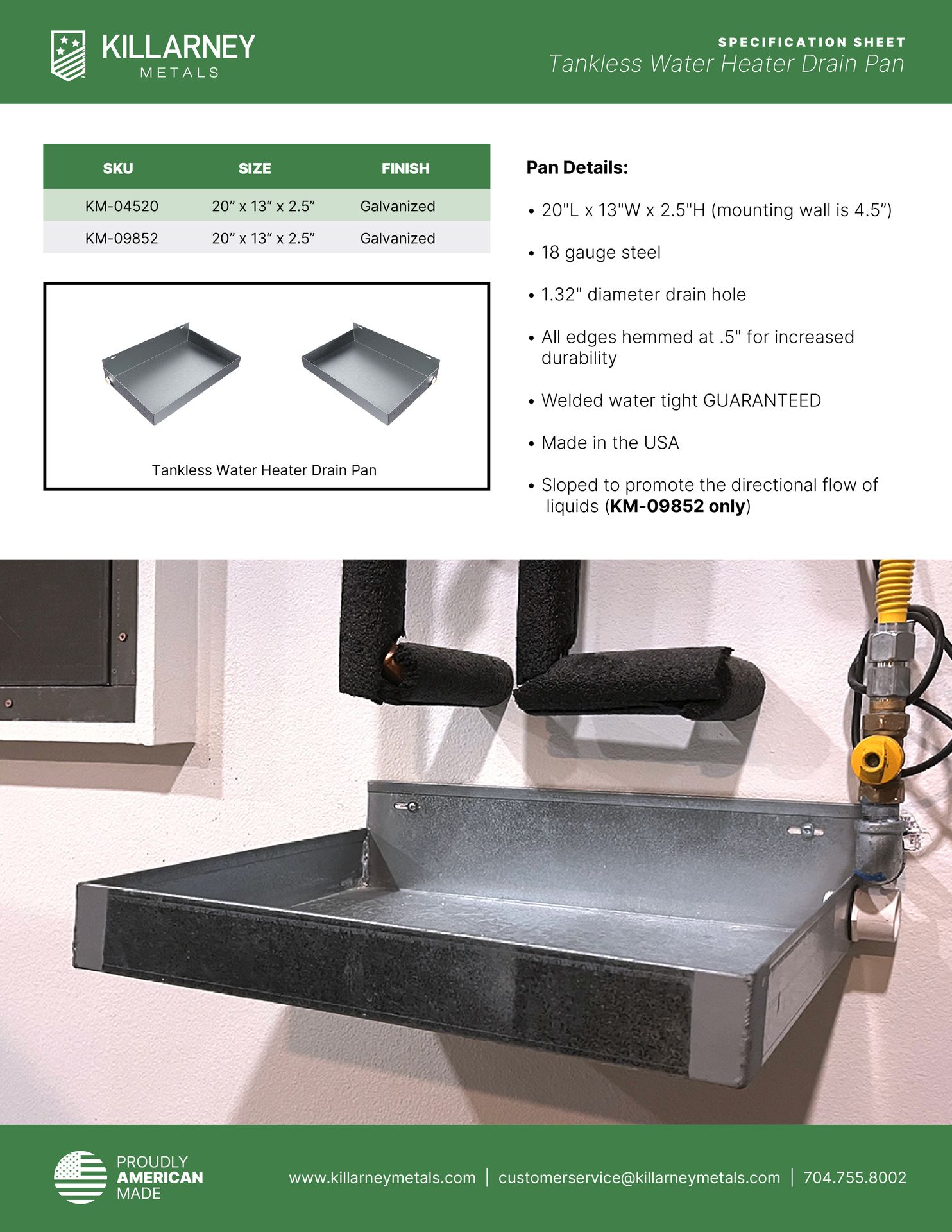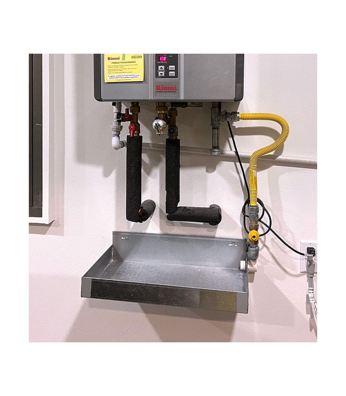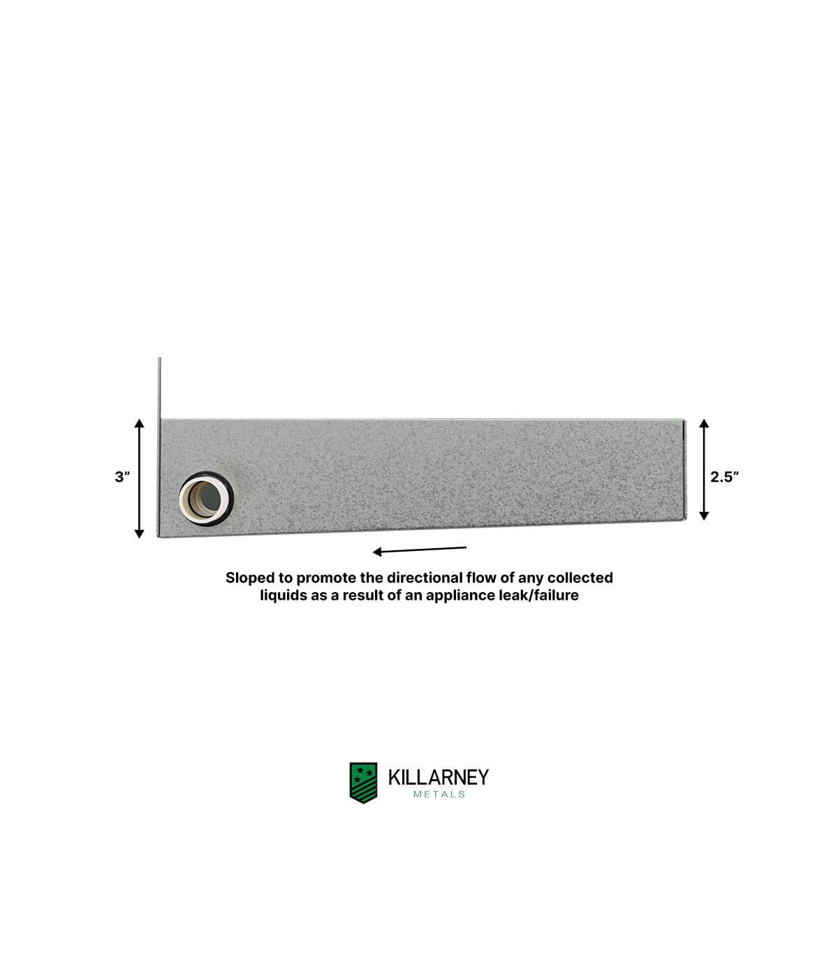 The Sloped Wall Mounted Tankless Water Heater Drain Pan is the premium solution for safeguarding your home, property, or business against potential water damage resulting from a faulty or leaking tankless water heater. This pan will cover the footprint of your appliance and its piping, and features a subtle slope to ensure efficient drainage by channeling water towards the drain hole. Specifically designed to seamlessly mount onto the wall, this drain pan offers maximum versatility and space optimization. This pan is manufactured in Galvanized Steel, providing reliable protection and giving you peace of mind and security. Don’t compromise on safety, trust Killarney Metals' American made pans for superior quality and performance. This pan is covered under the NoLeak+ Guarantee.